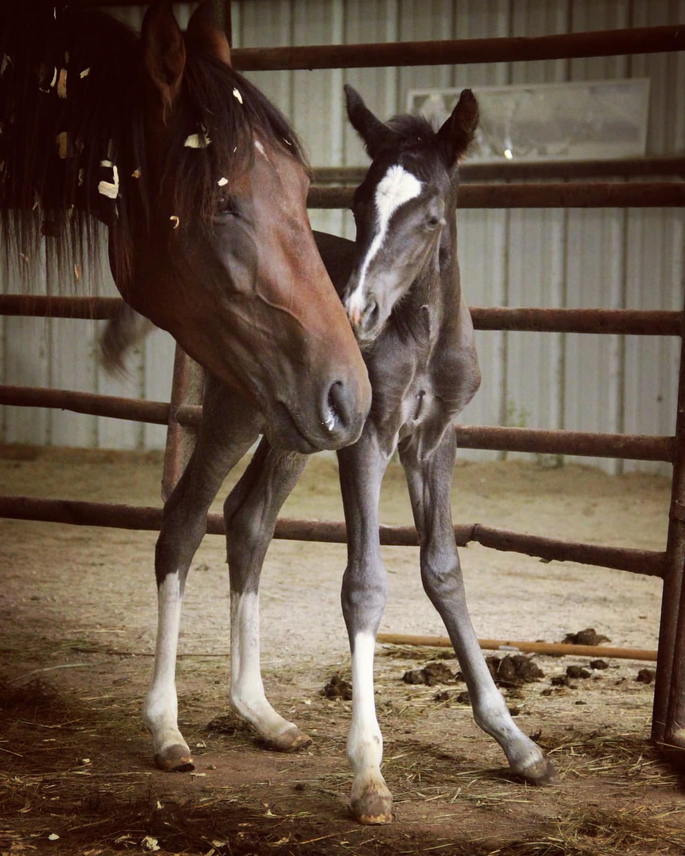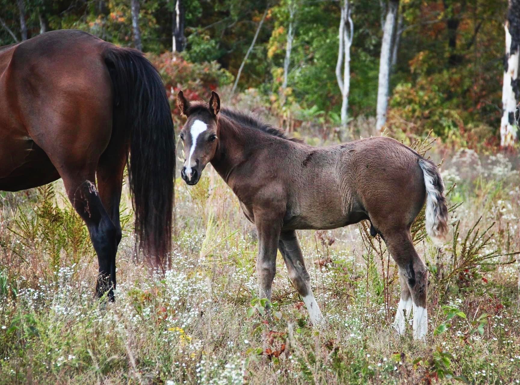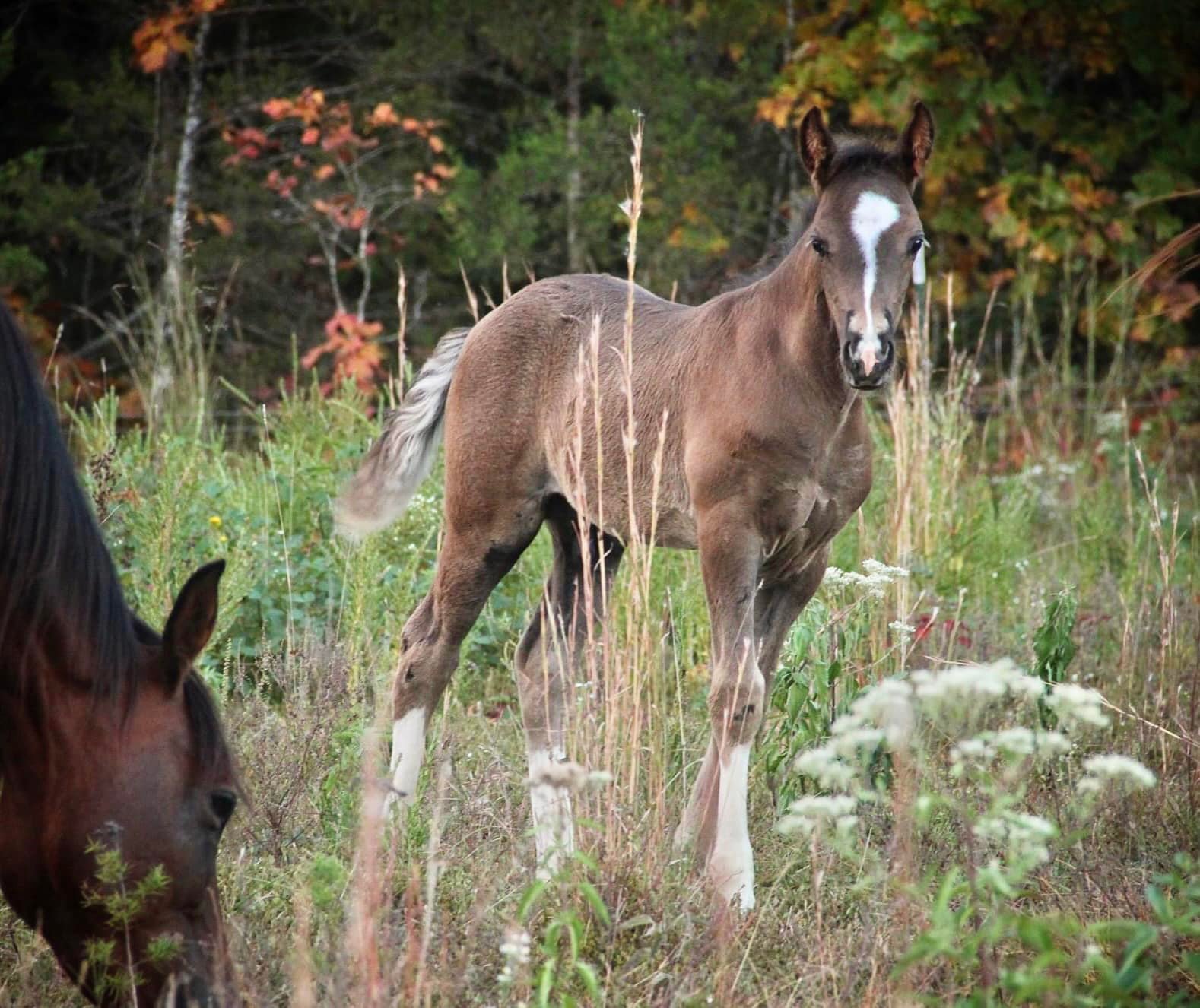 Boots was born right here on our homestead, and he holds a very special place in our hearts. He’s the first foal sired by our stallion, Bob—a proud palomino with a gentle disposition. Boots’ dam is Tootsy Roll, a beautiful bay mare who belongs to JR’s sister and lives just down the road at Grandma and Grandpa’s farm. From the moment he was born, we knew Boots was something special. His soft, muted black-gray coat, delicate white blaze, and three white stockings made him absolutely adorable—like he was dipped in paint and “missin’ a boot!”